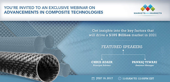 MarketsandMarkets™ is delighted to invite you to an exclusive webinar titled "Advancements in Composite Technologies", which will be organized on July 19, 2017 from 11:00 am to 12:00 pm EST. Join our experts – Chris Adair, Principal Advisor and Pankaj Tiwari, Assistant Manager with our Chemicals and Materials Practice as they speak about how composite technologies are evolving for mass production with extra benefits.