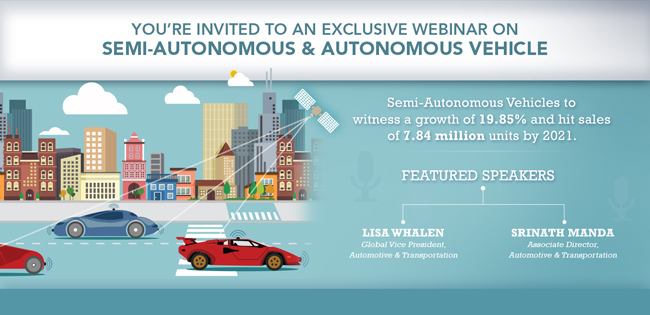 MarketsandMarkets™ is delighted to invite you to an exclusive webinar titled “Semi-Autonomous & Autonomous Vehicles”, which will be hosted on June 15, 2017 from 11:00 am to 12:00 pm EST. Please join our industry experts – Lisa Whalen, Global Vice President and Srinath Manda, Associate Director with our Automotive & Transportation practice as they discuss the key industry & technology trends that shall drive the business transformation that lie ahead for vehicle manufacturers and component suppliers.