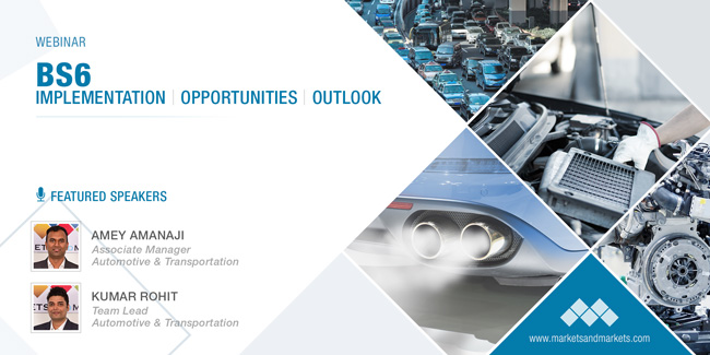 MarketsandMarkets™ is delighted to invite you to an exclusive webinar titled “BS6 – Implementation l Opportunities l Outlook” which will be hosted on June 26, 2019, from 4:00 pm to 5:00 pm IST. Please join our industry experts - Amey Amanaji, Associate Manager, Automotive & Transportation and Kumar Rohit, Team Lead, Automotive & Transportation as they discuss the upcoming key trends, industry use cases that has enabled business organizations to transform and align with its views.