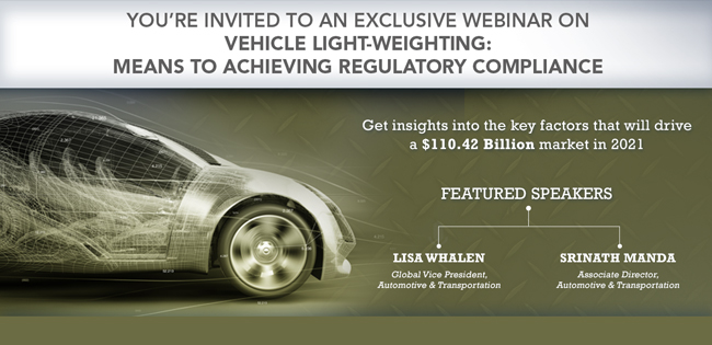 MarketsandMarkets™ is delighted to invite you to a webinar titled "Vehicle Light-Weighting: Means to Achieving Regulatory Compliance", which will be hosted on August 10, 2017 from 11:00 am to 12:00 pm (EST). Please join our experts – Lisa Whalen, Global Vice President and Srinath Manda, Associate Director with our Automotive & Transportation Practice as they discuss the key trends in the Automotive Light-Weighting Market.