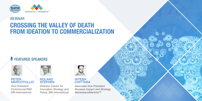 MarketsandMarkets™ and SRI International are delighted to invite you to a webinar titled "Crossing the Valley of Death: From Ideation to Commercialization", which will be hosted on August 20, 2019, from 11:00 am to 12:00 pm (PDT). Please join our speakers— Peter Marcotullio, Vice President - Commercial R&D, and Roland Stephen, Director - Center for Innovation Strategy & Policy at SRI International, and Hitesh Chittara, Associate Vice President - Revenue Impact and Strategy at MarketsandMarkets™ as they discuss knowledge transfer for university technology transfer offices in the US and Canada.