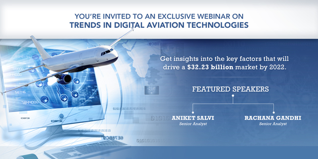 MarketsandMarkets™ is delighted to invite you to an exclusive webinar titled “Trends in Digital Aviation Technologies”, which will be hosted on October 25, 2017 from 11:00 am to 12:00 pm EST. Please join our industry experts – Rachana Gandhi and Aniket Salvi who are Senior Research Analysts with our Aerospace & Defense Practice, as they discuss the market trends in Digital Aviation Technologies that will drive the business transformation that organizations are looking for today.