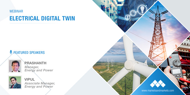 MarketsandMarkets™ is delighted to invite you to an exclusive webinar titled “Electrical Digital Twin Market Outlook", which will be hosted on July 24, 2019, from 11:00 am to 12:00 pm EST. Please join our industry experts—Prashanth, Manager, and Vipul, Associate Manager, Energy & Power, as they discuss the upcoming key trends, industry use cases that have enabled business organizations to transform their revenue mix.