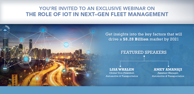MarketsandMarkets™ is delighted to invite you to a webinar titled “The Role of IoT in Next-Gen Fleet Management”, which will be hosted on September 13, 2017 from 11:00 am to 12:00 pm (EST). Please join our experts—Lisa Whalen, Global Vice President and Amey Amanaji, Assistant Manager with our Automotive & Transportation Practice as they discuss the key IoT trends that will impact fleet management in the near future.