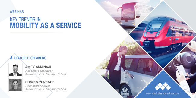 MarketsandMarkets™ is delighted to invite you to an exclusive webinar titled “MOBILITY AS A SERVICE (MAAS) AND ITS IMPACT ON URBAN MOBILITY” which will be hosted on 22 August 2019, from 11:00 am to 12:00 pm EST. Please join our industry experts— Amey Amanaji Associate Manager and Prasoon Khare Research Analyst, as they discuss the upcoming key trends, industry use cases that has enabled business organizations to transform and align with its views.