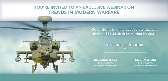MarketsandMarkets™ is delighted to invite you to an exclusive webinar titled “Trends in Modern Warfare”, which will be hosted on September 20, 2017 from 11:00 am to 12:00 pm EST. Please join our industry expert – Shekhar Kale and Anuj Mishra, Senior Analysts with the Aerospace & Defense Practice as they discuss the key market trends in modern warfare systems that drive the business transformation that organizations are looking for today.
