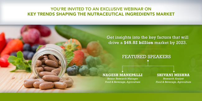 MarketsandMarkets™ is delighted to invite you to a webinar titled “Key Trends Shaping the Nutraceutical Ingredients Market”, which will be hosted on June 14, 2018, from 11:00 am to 12:00 pm (EST). Please join our experts—Nagesh Manepalli, Senior Research Manager, and Shivani Mishra, Research Analyst with our Food & Beverage Practice as they discuss the key trends that are shaping the Nutraceutical Ingredients Market, which will impact the food & beverage industry in the near future.
