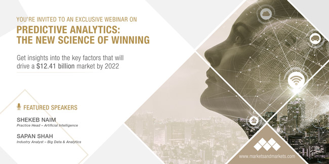 MarketsandMarkets™ is delighted to invite you to an exclusive webinar on “Predictive Analytics: The New Science of Winning", which will be hosted on November 15th, 2018 from 11:00 am to 12:00 pm EST. Please join our industry experts – Shekeb Naim and Sapan Shah, as they discuss the key predictive analytics trends that drive the business transformations organizations are looking for today.