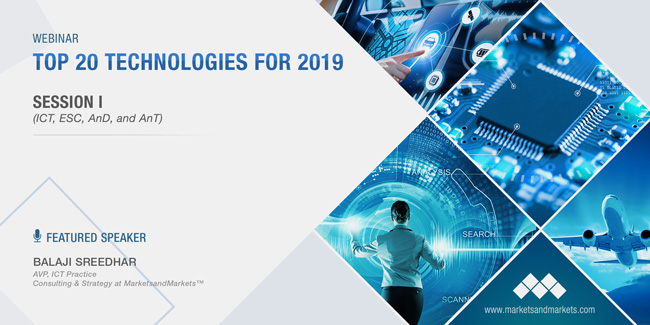 MarketsandMarkets™ is delighted to invite you to a webinar titled “Top 20 Technologies for 2019 – Session I", which will be hosted on February 7th, 2019 from 11:00 am to 12:00 pm EST. Please join our technology expert — Balaji Sreedhar, AVP, ICT Practice – Consulting & Strategy at MarketsandMarkets™, as he discuss the key high growth markets in the technology landscape that would impact the industry in 2019.