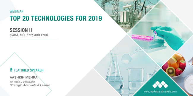MarketsandMarkets™ is delighted to invite you to a webinar titled “Top 20 Technologies for 2019 – Session II", which will be hosted on February 13th, 2019 from 11:00 am to 12:00 pm EST. Please join our technology expert — Aashish Mehra, Sr. VP, Strategic Accounts and Leader at MarketsandMarkets™, as he discuss the key high growth markets in the technology landscape that would impact the industry in 2019.