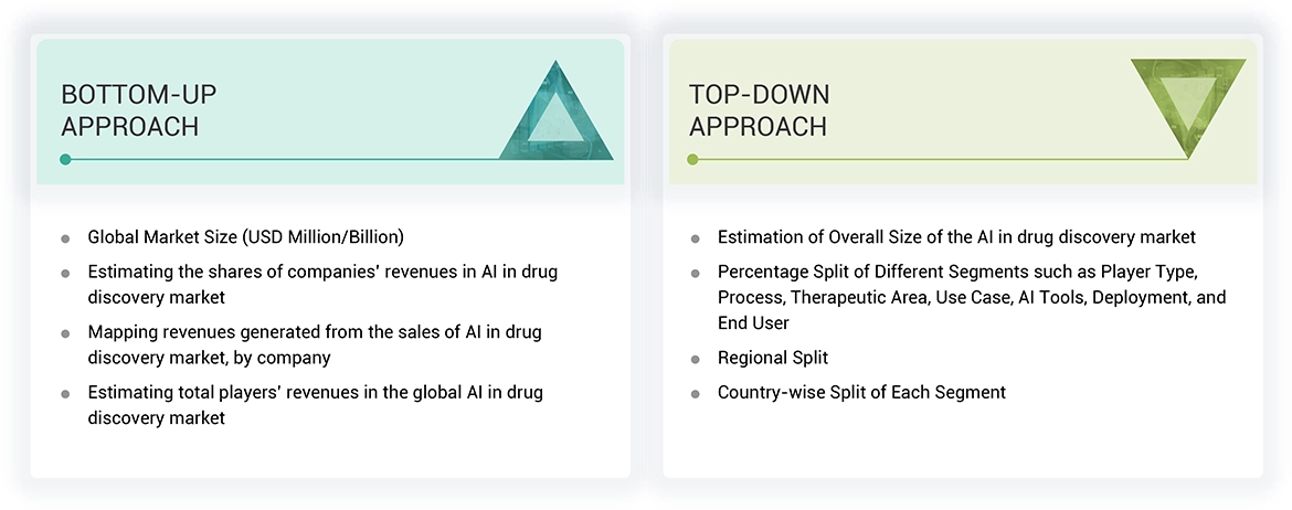 The study involved significant activities to estimate the current size of the artificial intelligence (AI) in drug discovery market. Exhaustive secondary research was done to collect information on artificial intelligence (AI) in drug discovery market. The next step was to validate these findings, assumptions, and sizing with industry experts across the value chain using primary research. Different approaches, such as top-down and bottom-up, were employed to estimate the total market size. After that, the market breakup and data triangulation procedures were used to estimate the market size of the segments and subsegments of the artificial intelligence (AI) in drug doscovery market.