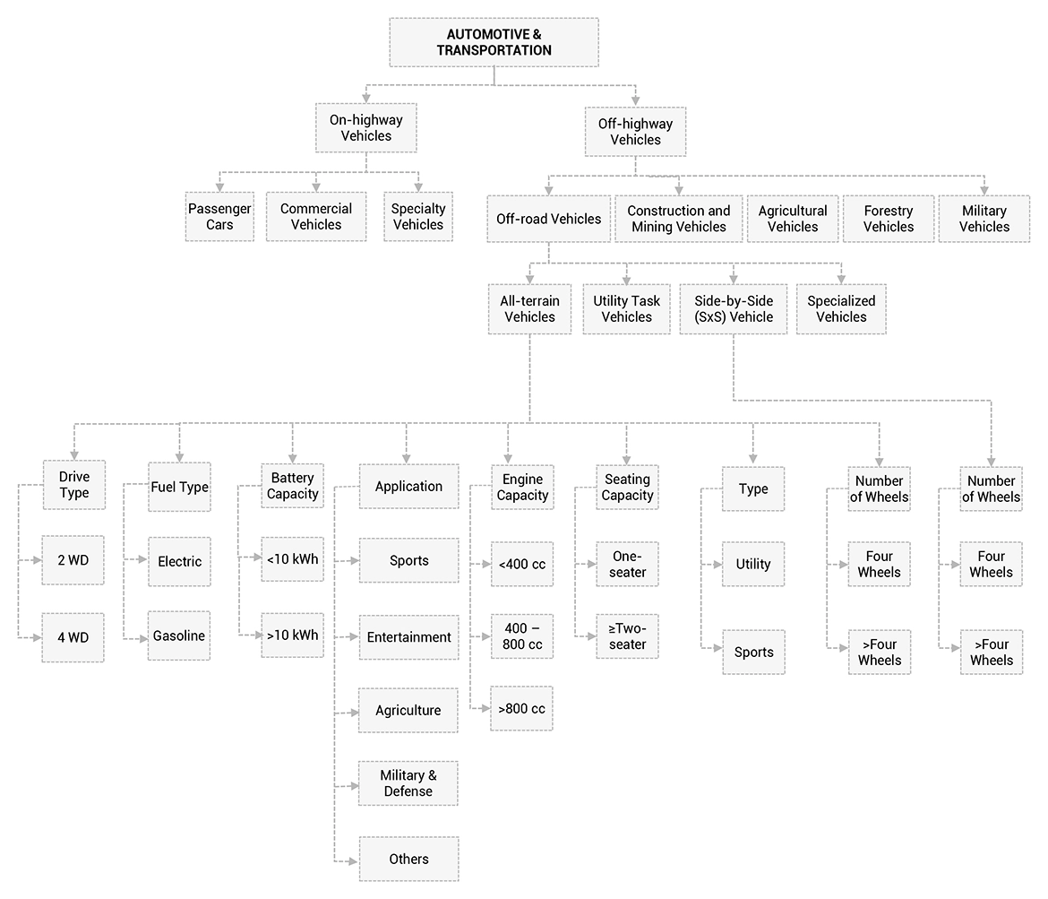 To define, describe, and forecast the all-terrain vehicle market in terms of value (USD million) and volume (units) based on the following segments: