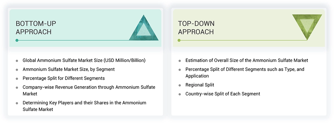 The study involved four major activities for estimating the current global size of the ammonium sulfate market. Exhaustive secondary research was conducted to gather information on the market, the peer market, and the parent market. The next step was to validate these findings, assumptions, and sizes with the industry experts across the value chain of ammonium sulfate through primary research. Both the top-down and bottom-up approaches were employed to estimate the overall size of the ammonium sulfate market. After that, market breakdown and data triangulation procedures were used to determine the size of different segments and sub-segments of the market.