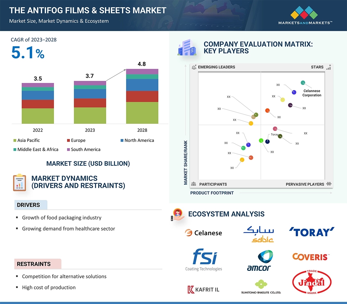Antifog films and sheets are specialized materials designed to prevent the formation of fog or condensation on transparent surfaces, ensuring clear visibility. They find applications in diverse industries such as food packaging, healthcare, agriculture, automotive, and electronics. The global antifog films and sheets market encompasses the production and distribution of these specialized materials. It is driven by factors like technological advancements, regulatory standards, and the increasing demand for clear visibility in various industries. The market caters to applications ranging from food packaging and medical devices to automotive and agricultural practices.