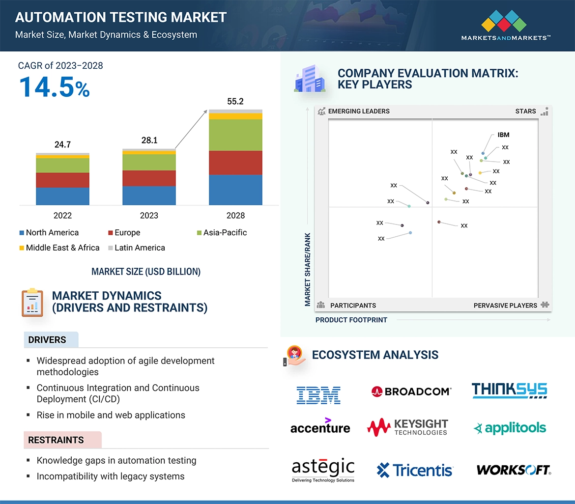 The automation testing market refers to the industry and ecosystem that involves the development, deployment, and utilization of automated tools, frameworks, and technologies to conduct software testing processes. Automation testing aims to streamline and enhance the efficiency of testing activities by automating the execution of test cases, reducing manual intervention, and providing rapid and repetitive testing capabilities. This market encompasses a wide range of tools and solutions designed to validate the functionality, performance, security, and reliability of software applications throughout the software development lifecycle. Key components of the automation testing market include test automation tools, frameworks, scripting languages, and associated services. The market addresses the growing need for organizations to accelerate their software development cycles, improve software quality, and adapt to the challenges posed by complex and dynamic software environments.