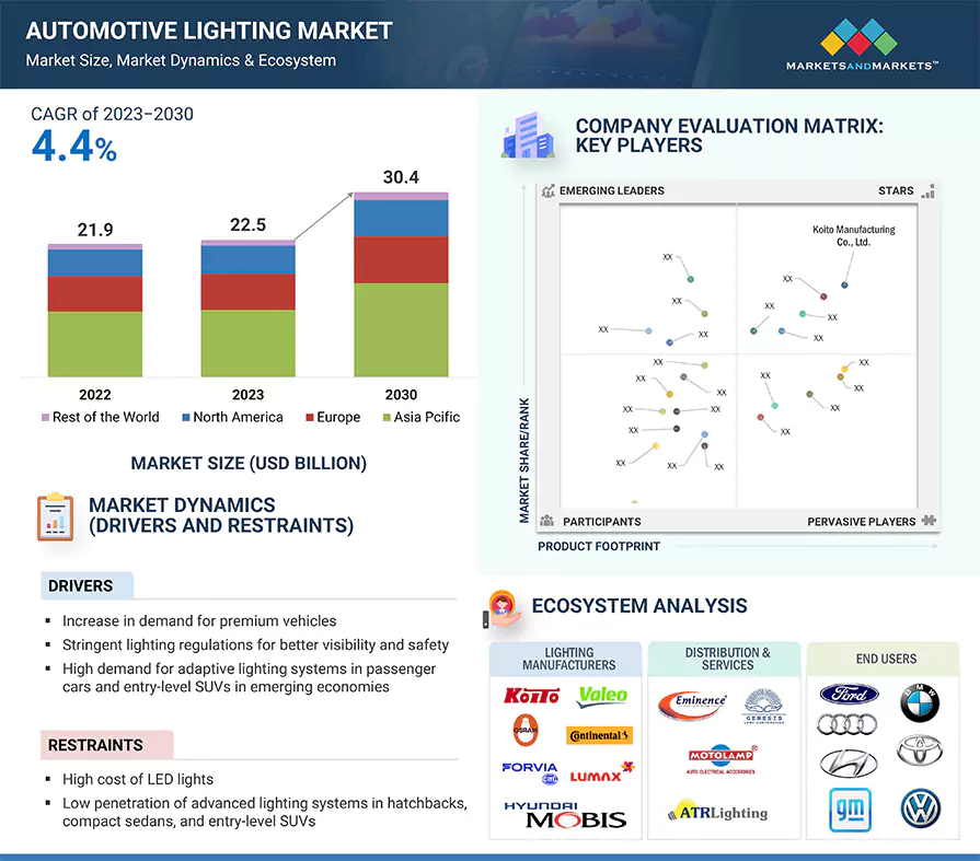 Automotive Lighting: An automotive lighting system consists of various lights and signaling devices that are fitted on the front, rear, side, and interior of the vehicle. These lights perform the primary function of providing illumination to the driver to drive safely in the dark. They may be used to enhance the visibility of an automobile, illuminate the interior, and act as a warning system for other vehicles. Automotive lighting ensures the vehicle's on-road safety and the pedestrian's by alerting the pedestrian about the vehicle's presence through exterior lighting.