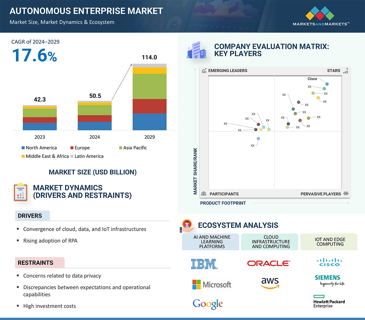 To determine and forecast the global autonomous enterprise market by offering (solution and services), business functions, applications, vertical, and region from 2024 to 2029, and analyze the various macroeconomic and microeconomic factors affecting the market growth.