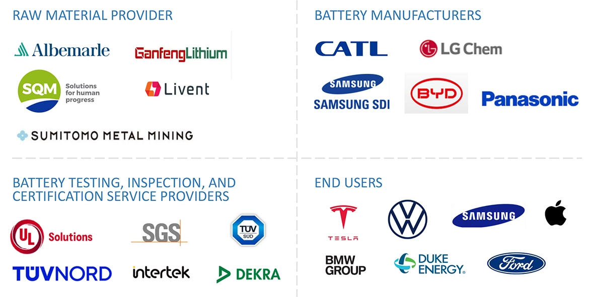Identifying different stakeholders in the battery testing, inspection, and certification market that influence the entire market, along with participants across the supply chain