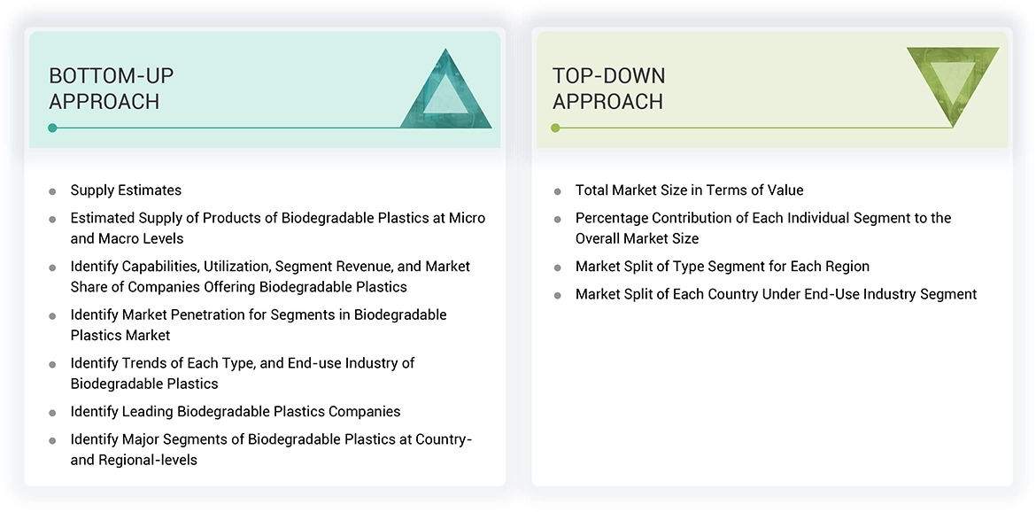 The study involved four major activities in estimating the market size of the biodegradable plastics market. Exhaustive secondary research was done to collect information on the market, the peer market, and the parent market. The next step was to validate these findings, assumptions, and sizing with industry experts across the value chain through primary research. Both top-down and bottom-up approaches were employed to estimate the complete market size. Thereafter, the market breakdown and data triangulation procedures were used to estimate the market size of the segments and subsegments.