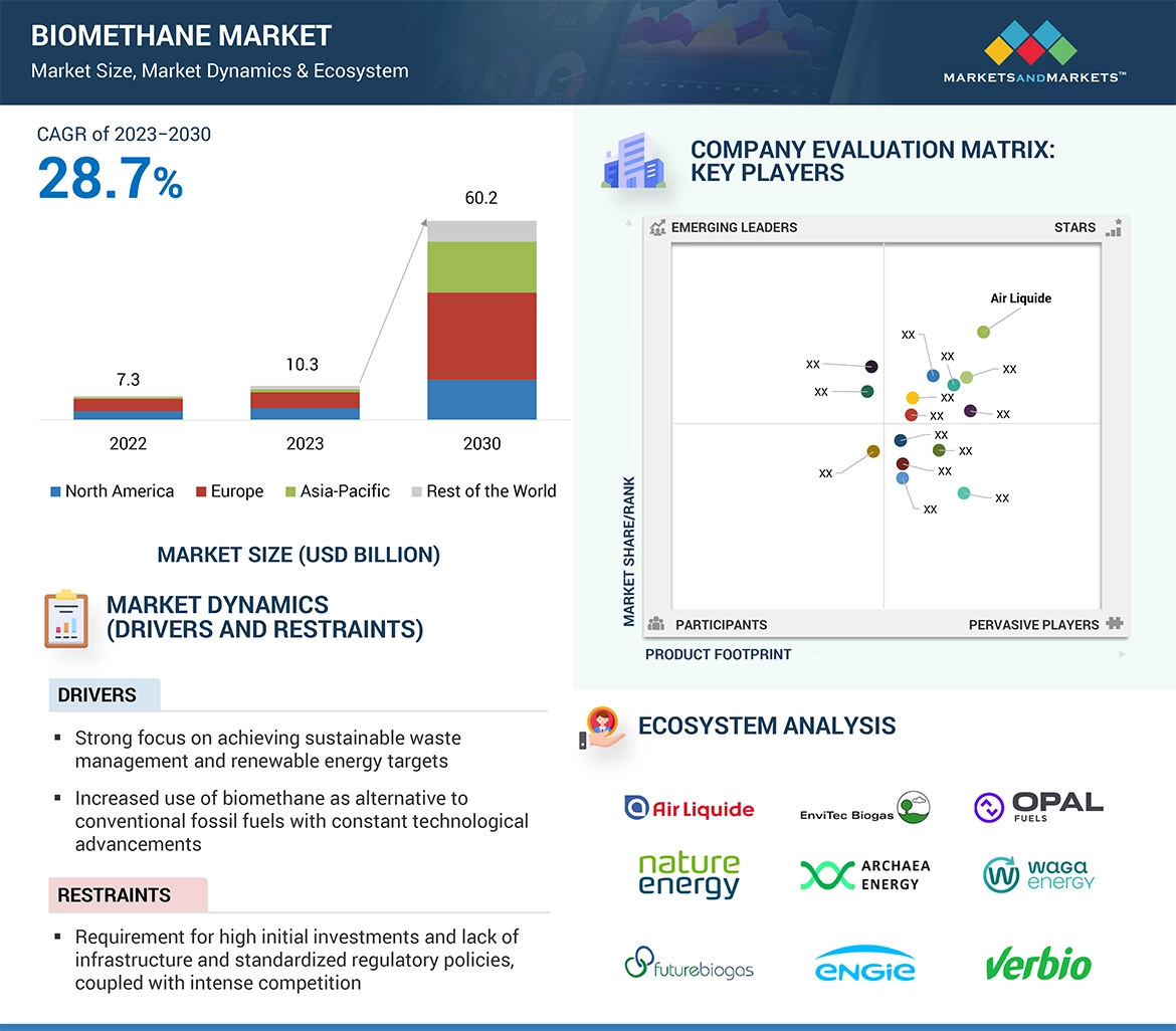 The biomethane market refers to the industry involved in the production, distribution, and utilization of biomethane, a renewable and sustainable natural gas derived from the anaerobic digestion or fermentation of organic materials such as agricultural residues, municipal solid waste, wastewater, and organic by-products. Biomethane, also known as renewable natural gas (RNG), is a clean energy source that can be seamlessly integrated into existing natural gas infrastructure, used for power generation, heating, and as a transportation fuel. The market encompasses various stakeholders, including biomethane producers, technology providers, and entities involved in the entire supply chain. Key drivers for the market include the global emphasis on reducing greenhouse gas emissions, government initiatives promoting renewable energy, advancements in biomethane production technologies, and a growing awareness of sustainable waste management practices. The market is characterized by a dynamic landscape with increasing investments, partnerships, and technological innovations to further enhance the efficiency and sustainability of biomethane production and utilization.
