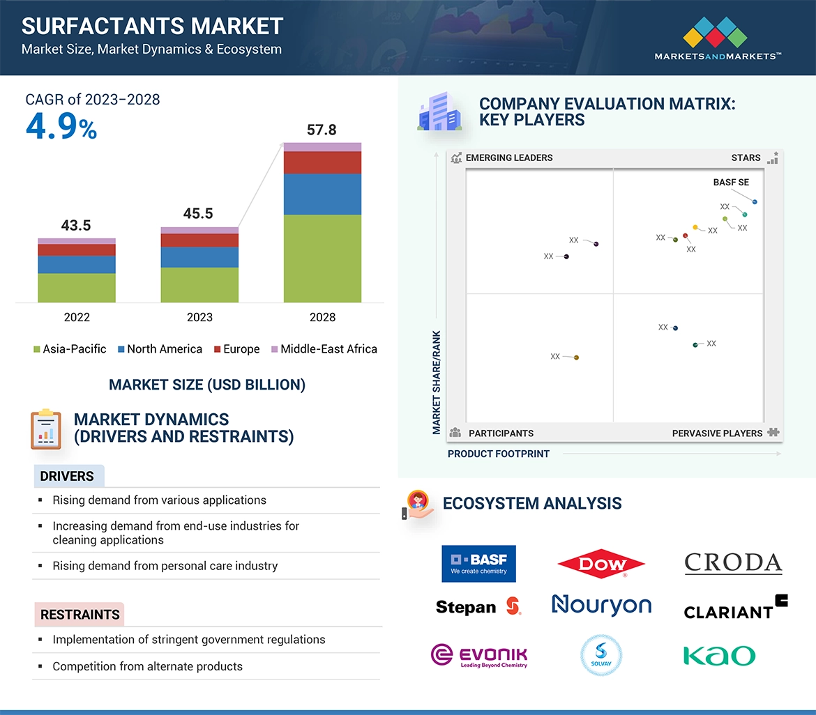 The surfactants market involves the manufacture and sale of surfactants designed primarily for use in home care, personal care, industrial & institutional cleaning, textile and other applications. These surfactants primarily lower the surface tension between two liquids, or between a liquid and a solid, or between a gas and a liquid. Surfactants offer advantages such as improved liquid spreading, stabilized emulsions, foam creation or defoaming, enhanced wetting and surface coating, hydrophobic substance dissolution, efficient cleaning, biocompatibility, and extended product stability.