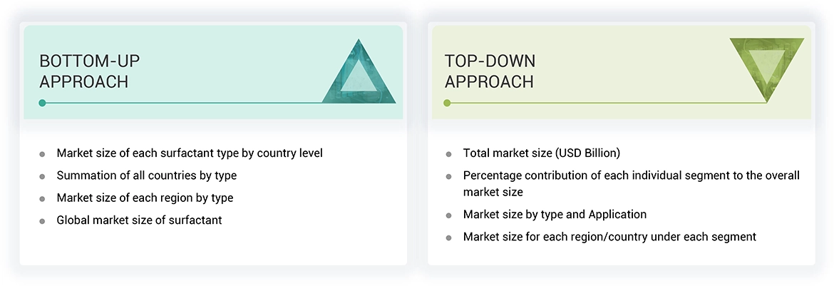 The study involved four major activities in estimating the market size for surfactants. Intensive secondary research was done to collect information on the market, the peer market, and the parent market. The next step was to validate these findings, assumptions, and sizing with industry experts across the value chain through primary research. Both top-down and bottom-up approaches were employed to estimate the complete market size. Post that, the market breakdown and data triangulation procedures were used to estimate the market size of the segments and subsegments.