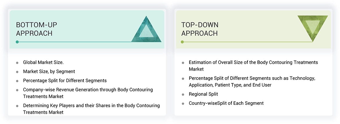 The study involved four major activities in estimating the current size of the body contouring treatments market. Exhaustive secondary research was done to collect information on the market, peer, and parent markets. The next step was to validate these findings, assumptions, and sizing with industry experts across the value chain through primary research. Both top-down and bottom-up approaches were employed to estimate the complete market size. After that, market breakdown and data triangulation were used to estimate the market size of segments and subsegments.