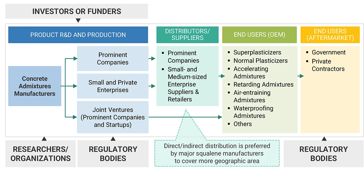 The concrete admixtures market comprises several stakeholders, such as raw material suppliers, end-product manufacturers, and regulatory organizations in the supply chain. The demand side of this market is characterized by superplasticizers, normal plasticizers, accelerating admixtures, retarding admixtures, air-entraining admixtures, waterproofing admixtures, and others. The supply side is characterized by advancements in technology and diverse application industries. Various primary sources from both the supply and demand sides of the market were interviewed to obtain qualitative and quantitative information.
