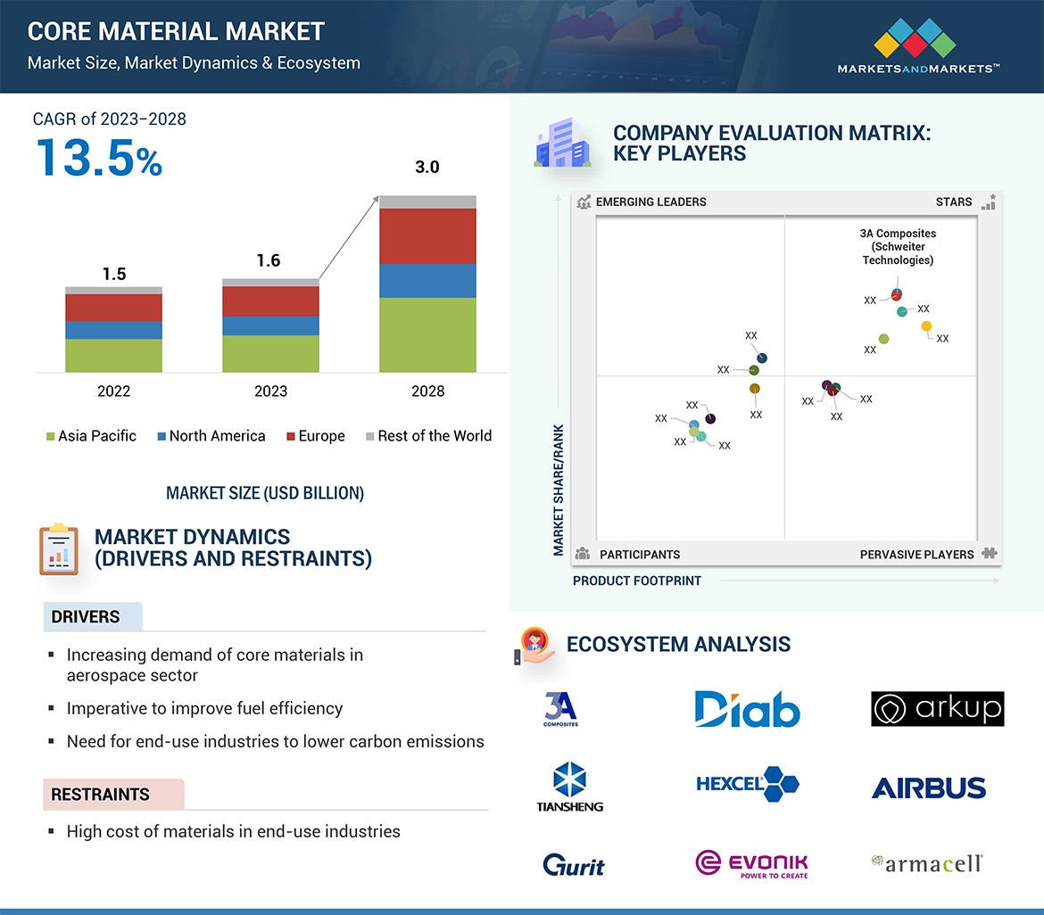 The term "core materials" describes a wide variety of materials that are used as essential parts of composite structures in a variety of sectors. These substances function as the inner or central core of sandwich composite structures, offering crucial characteristics including insulation, rigidity, and strength while keeping a thin profile. Core materials, which are commonly classified into categories like foam, balsa wood, and honeycomb structures, are widely used in a variety of industries, including construction, wind energy, aerospace, marine, automotive, and industrial manufacturing. The market for core materials is always changing due to advances in materials science and the increased emphasis on lightweight and sustainable solutions. This is because a variety of end-use sectors are seeing a growing need for high-performance and affordable alternatives.