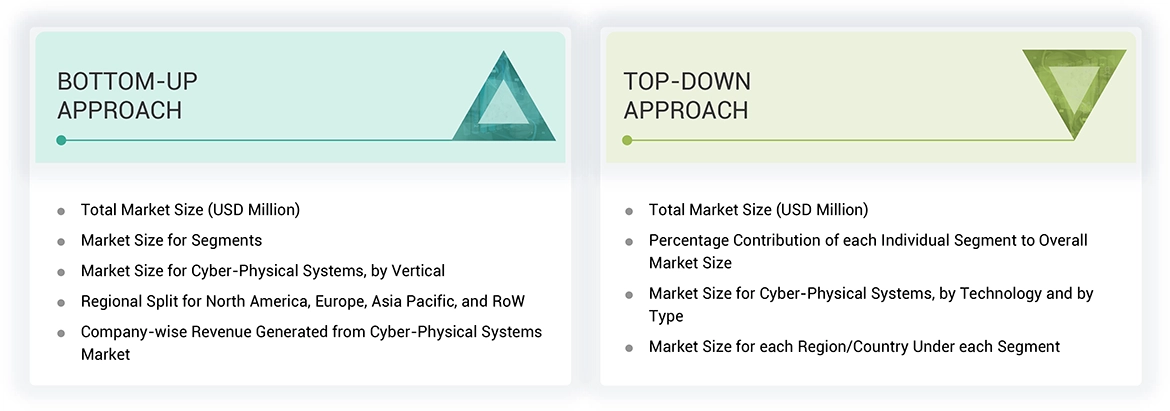 The study involved four major activities in estimating the current size of the cyber-physical systems market—exhaustive secondary research collected information on the market, peer, and parent markets. The next step was to validate these findings, assumptions, and sizing with industry experts across the value chain through primary research. Both top-down and bottom-up approaches were employed to estimate the complete market size. After that, market breakdown and data triangulation were used to estimate the market size of segments and subsegments.
