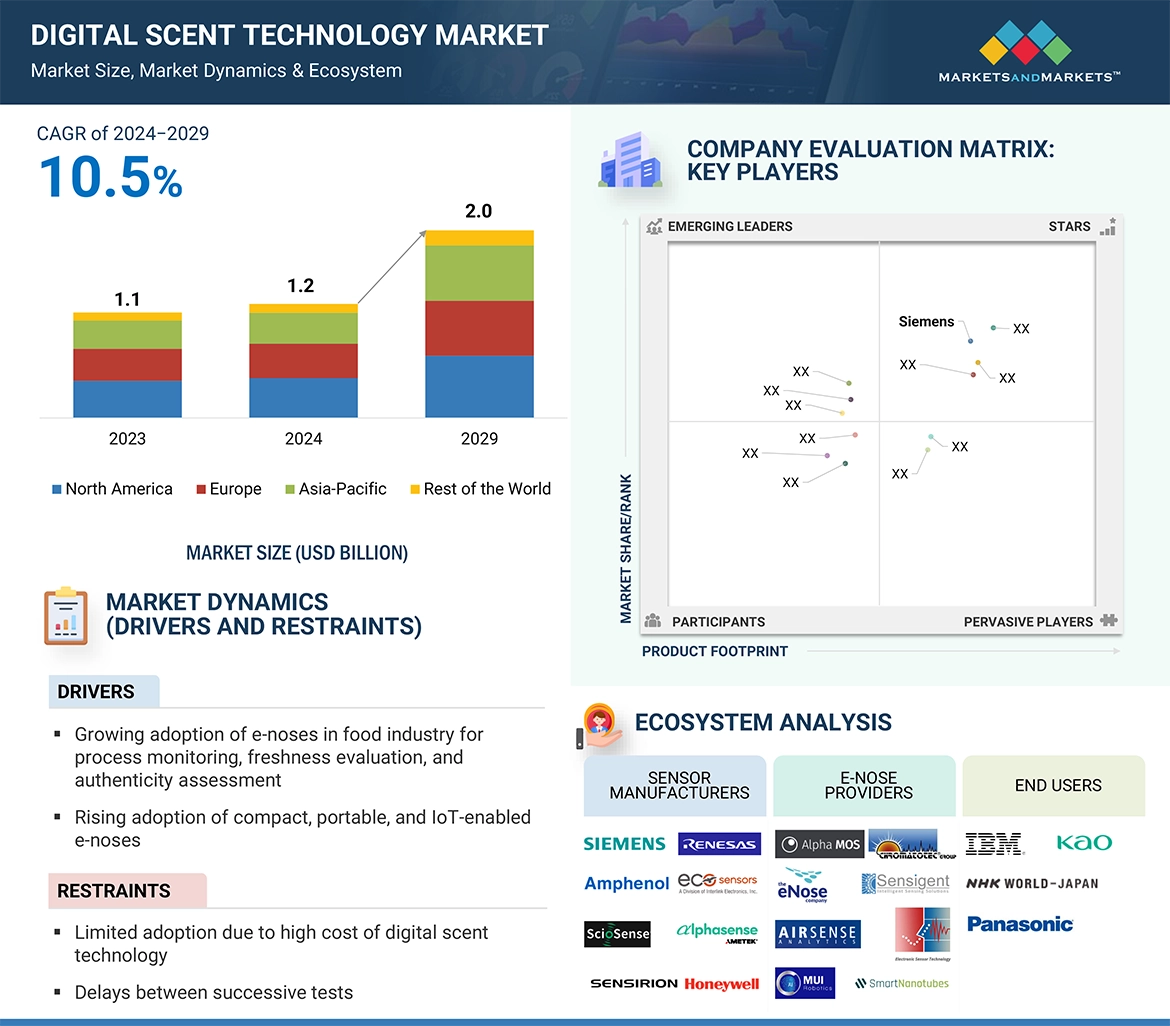 Digital scent technology involves transmitting, receiving, and perceiving scented digital media through hardware devices like e-noses and scent synthesizers. An e-nose, equipped with an array of gas sensors, is designed to detect various odors, while a scent synthesizer releases scents from electronic devices such as TVs, smartphones, and tablets. This technology finds applications across diverse industries, including military & defense, food & beverage, medical, marketing, entertainment, environmental monitoring, and others like communication, agriculture, public security, transportation, and research and development. Despite its potential, the technology is still in its early stages, requiring dedicated partners and strategic investments to tailor its outcomes for companies aiming to incorporate scent as part of their branding strategy.