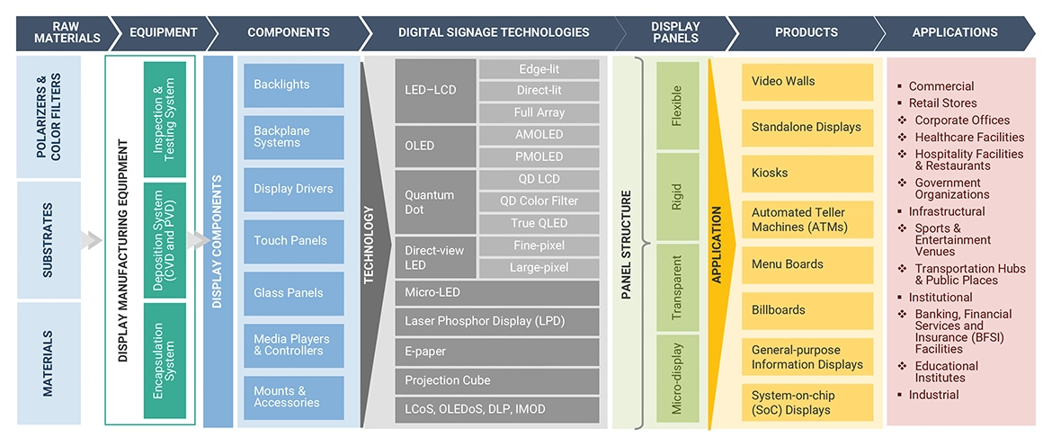 This digital setup displays multimedia or video content for information or advertising objectives. It uses LCD, OLED, direct-view LED, micro-LED, and other displays, such as projection cubes and e-paper, to display digital photos, videos, web sites, weather data, restaurant menus, and text. It is employed in a variety of venues, including retail establishments, transportation networks, public places, museums, stadiums, hotels, restaurants, and office buildings.