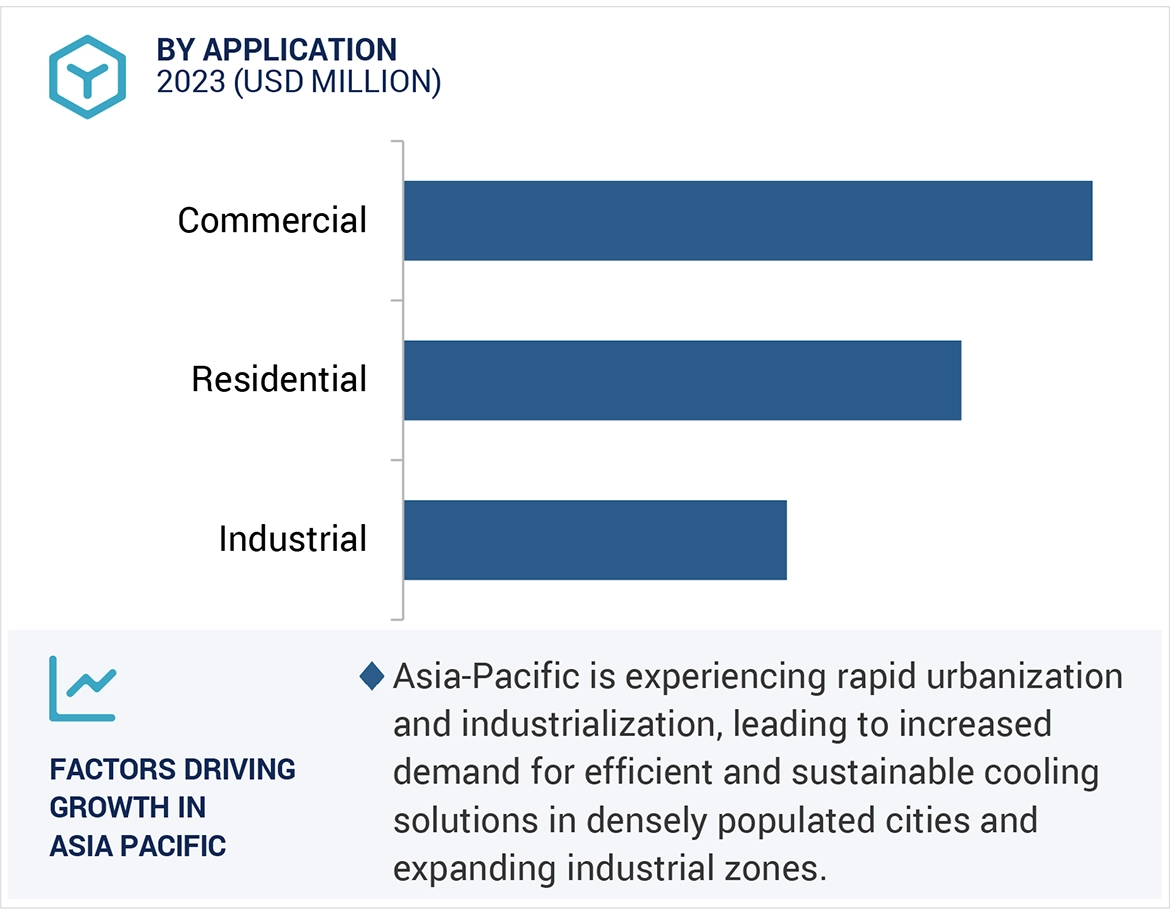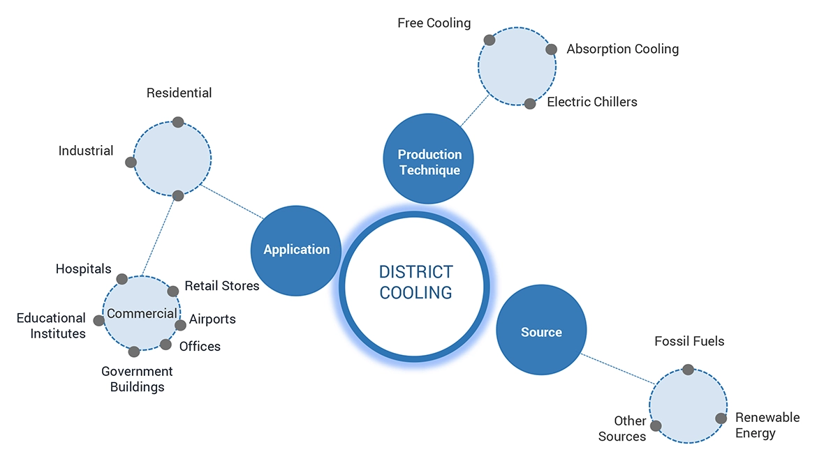 District cooling market encompasses the district cooling system that centralizes cooling energy production and distribution via chilled water from a central plant to multiple buildings through underground pipelines. It eliminates individual building cooling systems, enhancing efficiency and sustainability. Serving diverse sectors like commercial, residential, and industrial, district cooling reduces energy consumption and greenhouse gas emissions. Users purchase cooling services from providers, benefiting from shared infrastructure and operational cost savings. Scalable and adaptable, these systems support urban development with efficient cooling solutions, making them pivotal in modern urban planning for energy efficiency and environmental sustainability.