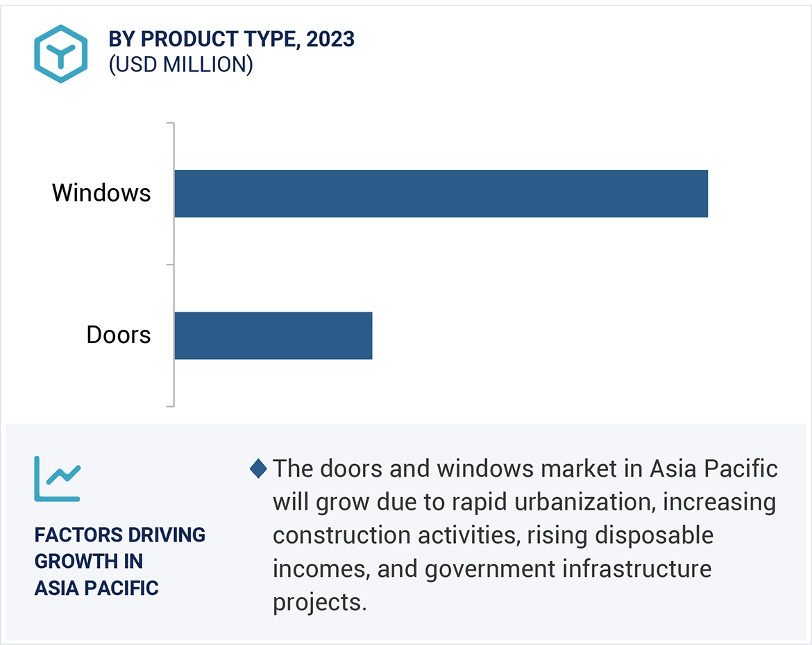 The Asia Pacific region is estimated to be the fastest-growing in the doors & windows market. The growth is largely because of the booming population and urbanization in the region and growing demand from residential, commercial, and industrial sectors. Asia Pacific includes China, Japan, India, South Korea, and the Rest of Asia Pacific. According to the United Nations Population Fund, the Asia Pacific region, which includes large nations like China and India, accounts for 60% of the world's population, or 4.7 billion people. Rapid urbanization, driven by population expansion and migration to metropolitan areas, has increased demand for residential and commercial building. As more buildings are constructed, the need for doors and windows, which are key components of these structures, grows significantly. China and India are the main sources of this demand. In China, government initiatives aimed at urban renewal and modernization are driving significant expansion in the construction of high-rise residences, commercial complexes, and public infrastructure. Similarly, India's "Housing for All" program and smart city initiatives are increasing the demand for new doors and windows.The International Monetary Fund (IMF) predicts that China, Japan, and India will be the world's second, fourth, and fifth largest economies in 2024. Economic expansion raises disposable earnings, allowing consumers to spend in higher-quality, more aesthetically pleasing doors and windows. Furthermore, the expansion of commercial and industrial sectors in these economies drives the demand for durable and efficient doors & windows to meet the requirements of modern facilities and offices. This growth in the doors & windows market is led by China, India, and Japan due to the large consumer markets as well as for having presence of key doors & windows manufacturers. Therefore, the Asia Pacific region is establishing itself as an important market for global production and consumption of doors & windows and is expected to continue its growth throughout forecast period.