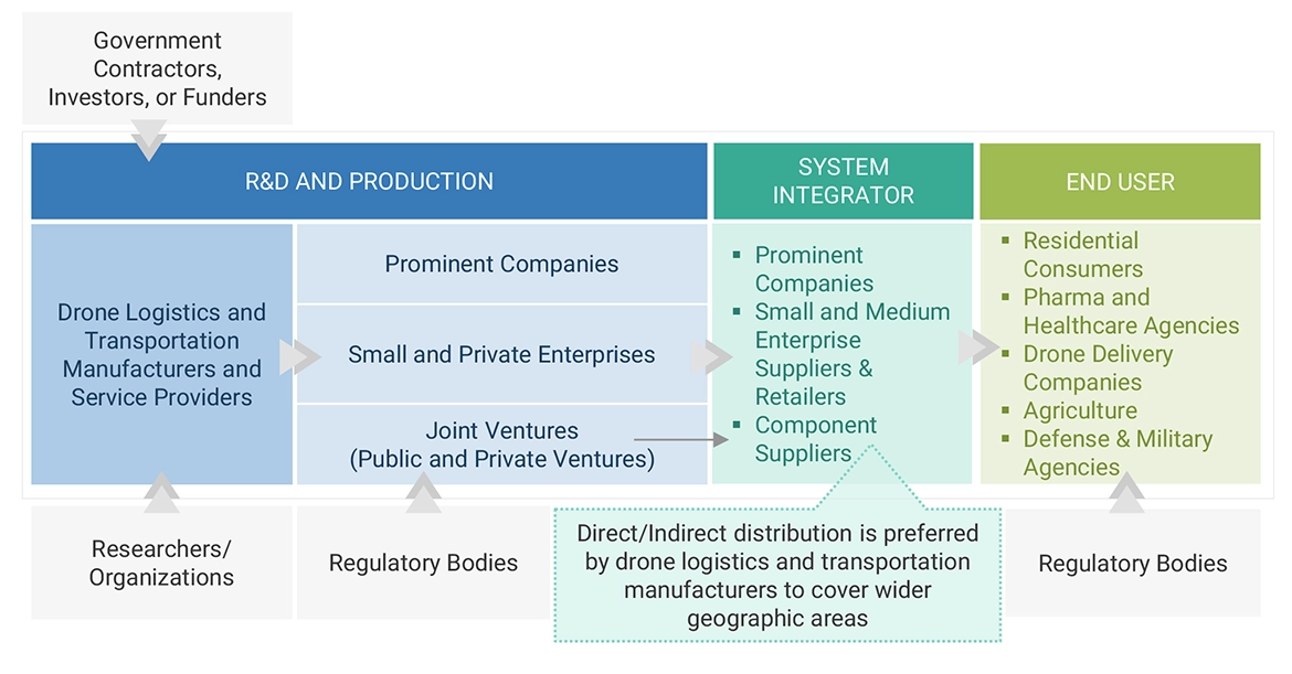 The study involved four major activities in estimating the current size of the drone logistics and transportation market. Exhaustive secondary research was done to collect information on the drone logistics and transportation market, its adjacent markets, and its parent market. The next step was to validate these findings, assumptions, and sizing with industry experts across the value chain through primary research. Demand-side analyses were carried out to estimate the overall size of the market. After that, market breakdown and data triangulation procedures were used to estimate the sizes of different segments and subsegments of the drone logistics and transportation market.