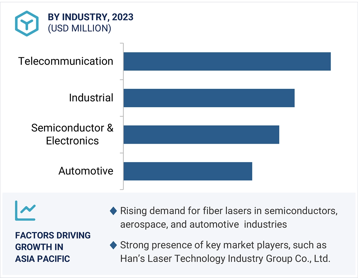 Fiber lasers are a type of solid-state laser which uses optical fiber, doped with rare earth elements which acts as the active gain medium. Optical fiber converts light from pump laser diodes into a laser beam with specific wavelengths. Neodymium, ytterbium, praseodymium, erbium, thulium, holmium, and dysprosium are used as doping elements. Due to this wide range of produced wavelengths, fiber lasers are ideal for a variety of applications such as laser cutting, texturing, cleaning, engraving, drilling, marking, and welding. The industries that use fiber laser technology include commercial, telecommunications, research, aerospace, healthcare, automotive, semiconductor & electronics, industrial, and others (oil & gas, iron & steel, tobacco, glass, wood, retail, and plastics).