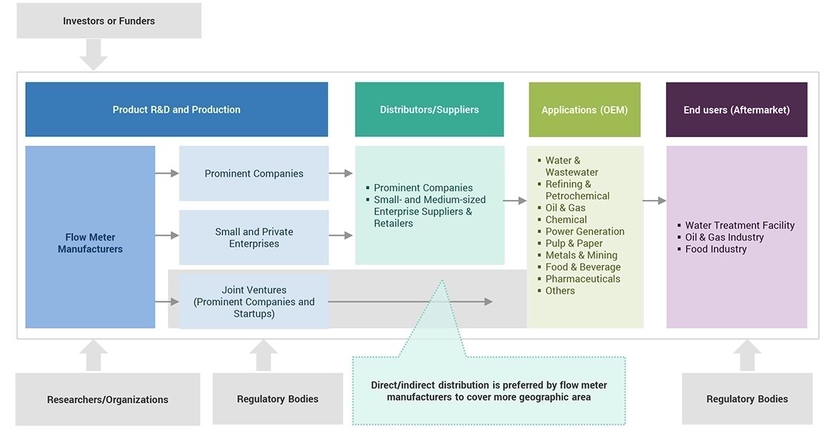 The flow meter market comprises several stakeholders, such as raw material suppliers, end-product manufacturers, and regulatory organizations in the supply chain. The demand side of this market is characterized from key opinion leaders in various applications for the flow meter. The supply side is characterized by advancements in technology and diverse application industries. Various primary sources from both the supply and demand sides of the market were interviewed to obtain qualitative and quantitative information.