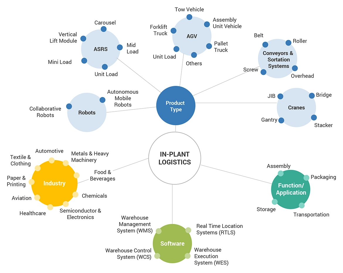 The key objectives of in-plant logistics include minimizing idle time for both labor and equipment, optimizing storage space, and ensuring that the right materials are available at the right place and time for the production process. This involves the use of advanced technologies, such as warehouse management systems (WMS) and automated guided vehicles (AGVs), to facilitate efficient material handling and tracking. By focusing on the internal movements of goods within a facility, in-plant logistics contributes to overall supply chain effectiveness, enhancing the competitiveness of the manufacturing operation in terms of cost, speed, and responsiveness to market demands. We are considering only the products used for logistics activities related to manufacturing plant plants for production and storage.