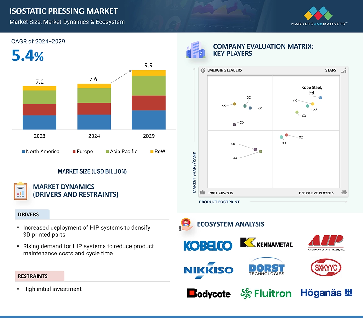Isostatic pressing is a powder metallurgy-based process in which equal pressure is applied on powdered materials, such as metals, alloys, or ceramics, in all directions to achieve maximum uniformity of density and microstructure without the geometric limitations of uniaxial pressing. This process is categorized into two types: hot isostatic pressing (HIP) and cold isostatic pressing (CIP). The HIP processes materials using the synergistic effects of temperature and pressure. It is used as a part of the powder metrology process for pressure-assisted brazing and fabrication of metal composites. Manufacturing companies extensively install HIP systems to enhance their working efficiency. Meanwhile, the CIP is a powder-forming technology that applies uniform pressure to compress powdered materials into various shapes, mainly at room temperature. This technology is widely used in ceramic and powder metallurgy as an effective forming method. In the CIP system, a mold is placed into a chamber filled with a working fluid, usually water, with a corrosion inhibitor pressurized using an external pump.