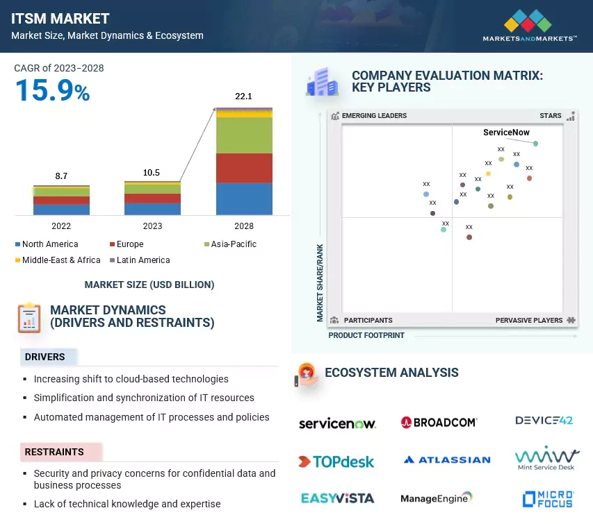 Considering the views of various sources and associations on ITSM, MarketsandMarkets defines ITSM as "a comprehensive approach and set of practices designed to plan, design, deliver, operate efficiently, and control information technology services within an organization. ITSM focuses on aligning IT services with the needs of the business, emphasizing the delivery of value to customers and end-users. It involves implementing processes, workflows, and best practices to manage the entire service lifecycle, from service strategy and design to transition, operation, and continual improvement. ITSM frameworks, such as ITIL (Information Technology Infrastructure Library), guide organizations in establishing standardized and effective practices for service delivery, incident management, problem resolution, change management, and other critical aspects of IT operations. ITSM aims to ensure that IT services meet business objectives, deliver a positive user experience, and adapt to evolving technological and organizational requirements".