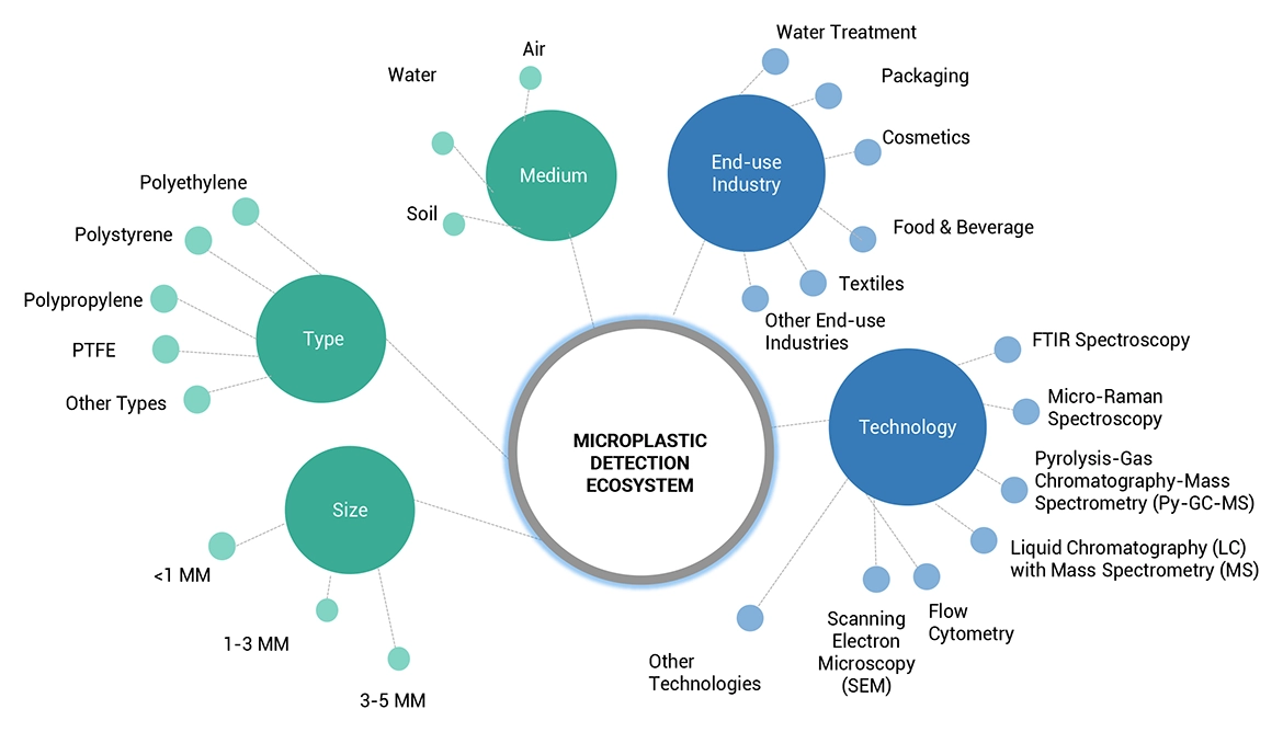 Microplastic detection is a relatively new, rapidly developing field focused on the development and application of technologies and methodologies for identifying and quantifying microplastic particles in ecosystems, industries, and consumer products. Detection of microplastics is extremely challenging due to the complexity of the task and the necessitates the use of advanced analytical techniques: spectroscopy, chromatography, microscopy, and emerging technologies such as sensor-based automated systems and machine learning algorithms. These tools are capable of identifying and quantifying the presence of microplastics in a wide variety of matrices, running from marine and fresh environments, soil, air, and human tissues. This is accompanied by a demand from environmental agency, research institutions, water treatment facilities, and manufacturing industries that can help manage microplastic pollution and comply with regulatory standards.