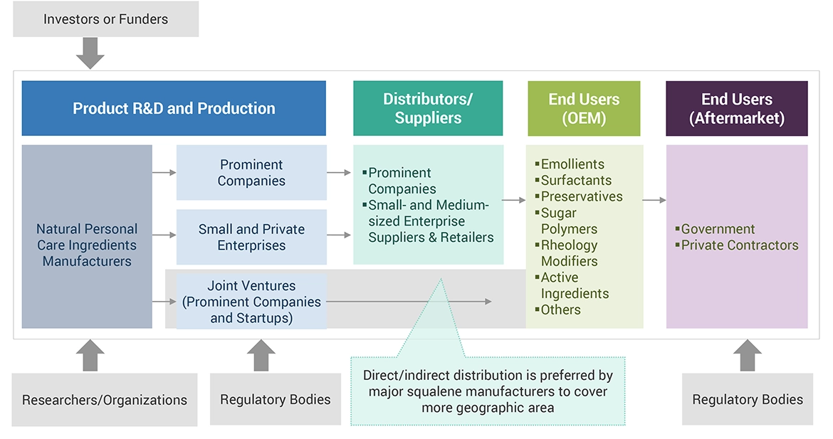 The natural personal care ingredients market comprises several stakeholders, such as raw material suppliers, end-product manufacturers, and regulatory organizations in the supply chain. The demand side of this market is characterized by emollients, preservatives, active ingredients, surfactants, rheology modifiers, sugar polymers, and others. The supply side is characterized by advancements in technology and diverse application industries. Various primary sources from both the supply and demand sides of the market were interviewed to obtain qualitative and quantitative information.