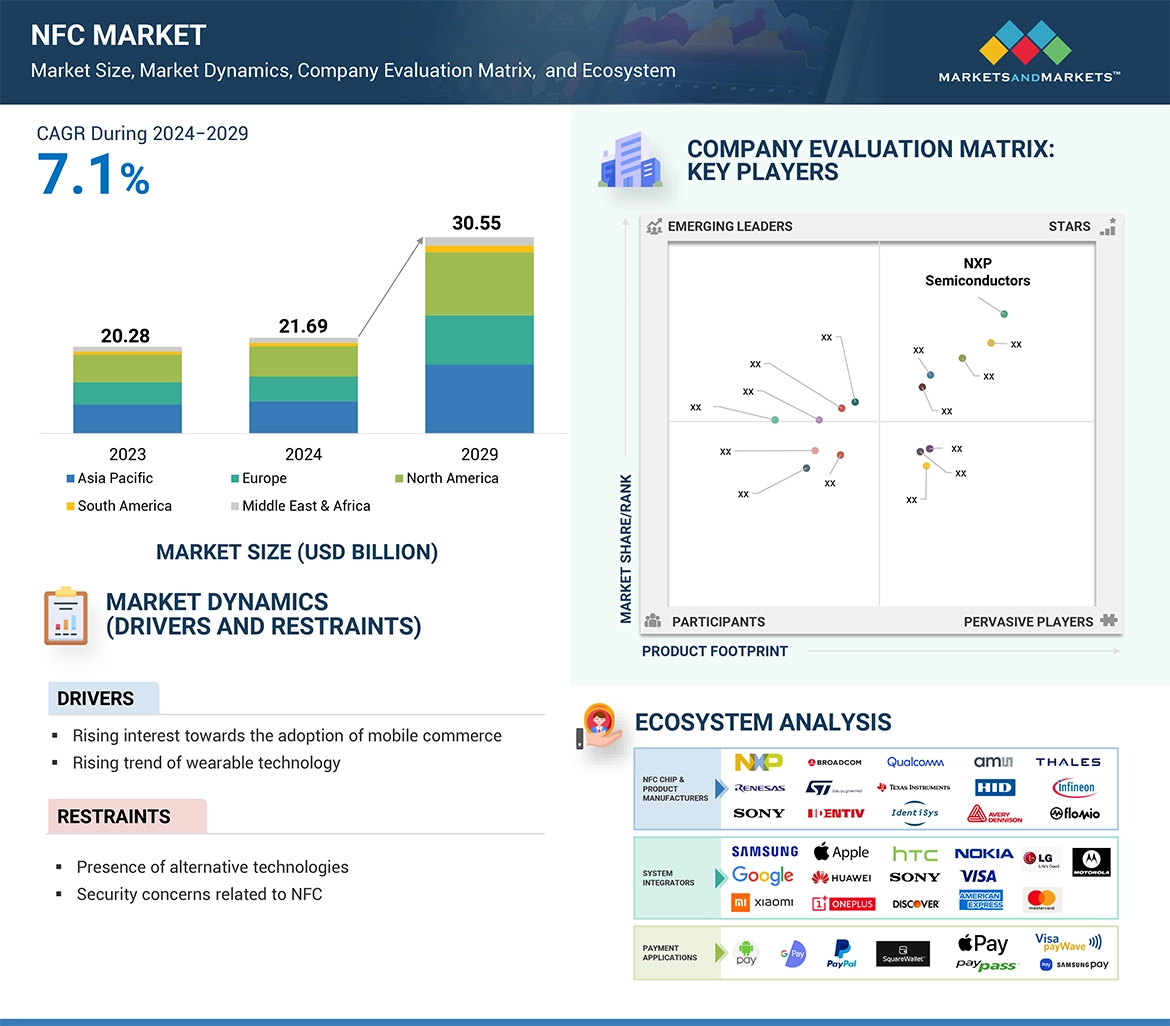 The global NFC market is anticipated to grow from USD 21.69 billion in 2024 to USD 30.55 billion by 2029, recording a CAGR of 7.1% during the forecast period. Key growth drivers include the rising adoption of mobile commerce, increased demand for smart wearables and IoT devices, and the expansion of NFC solutions offering enhanced user experiences and security over competing contactless technologies.