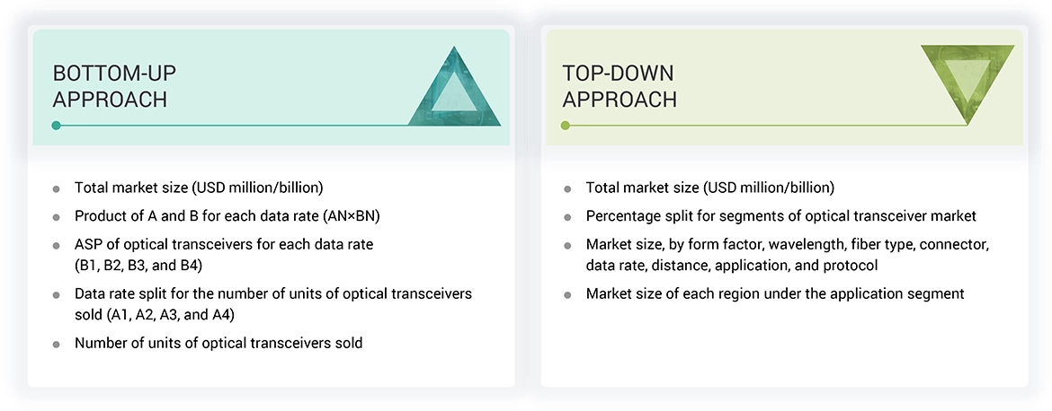 The study involved four major activities in estimating the size of the optical transceiver market. Exhaustive secondary research has been done to collect information on the market, peer market, and parent market. Validation of these findings, assumptions, and sizing with industry experts across the value chain through primary research has been the next step. Both top-down and bottom-up approaches have been employed to estimate the global market size. After that, market breakdown and data triangulation have been used to estimate the market sizes of segments and subsegments.