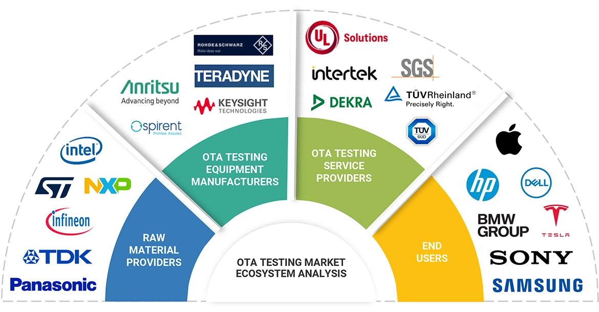 Identifying different stakeholders in the OTA testing market that influence the entire market, along with participants across the supply chain