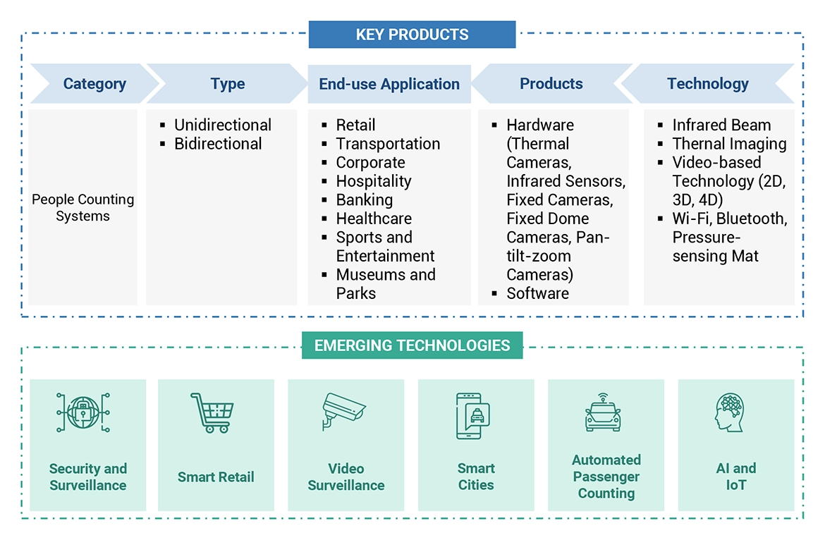 To describe, segment, and forecast the overall people counting system market based on type, technology, offering, and end-use application