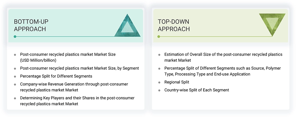 The study involved four major activities for estimating the current size of the global post-consumer recycled plastics market. Exhaustive secondary research was carried out to collect information on the market, the peer product market, and the parent product group market. The next step was to validate these findings, assumptions, and sizes with the industry experts across the value chain of post-consumer recycled plastics through primary research. Both the top-down and bottom-up approaches were employed to estimate the overall size of the post-consumer recycled plastics market. After that, market breakdown and data triangulation procedures were used to determine the size of different segments and sub-segments of the market.
