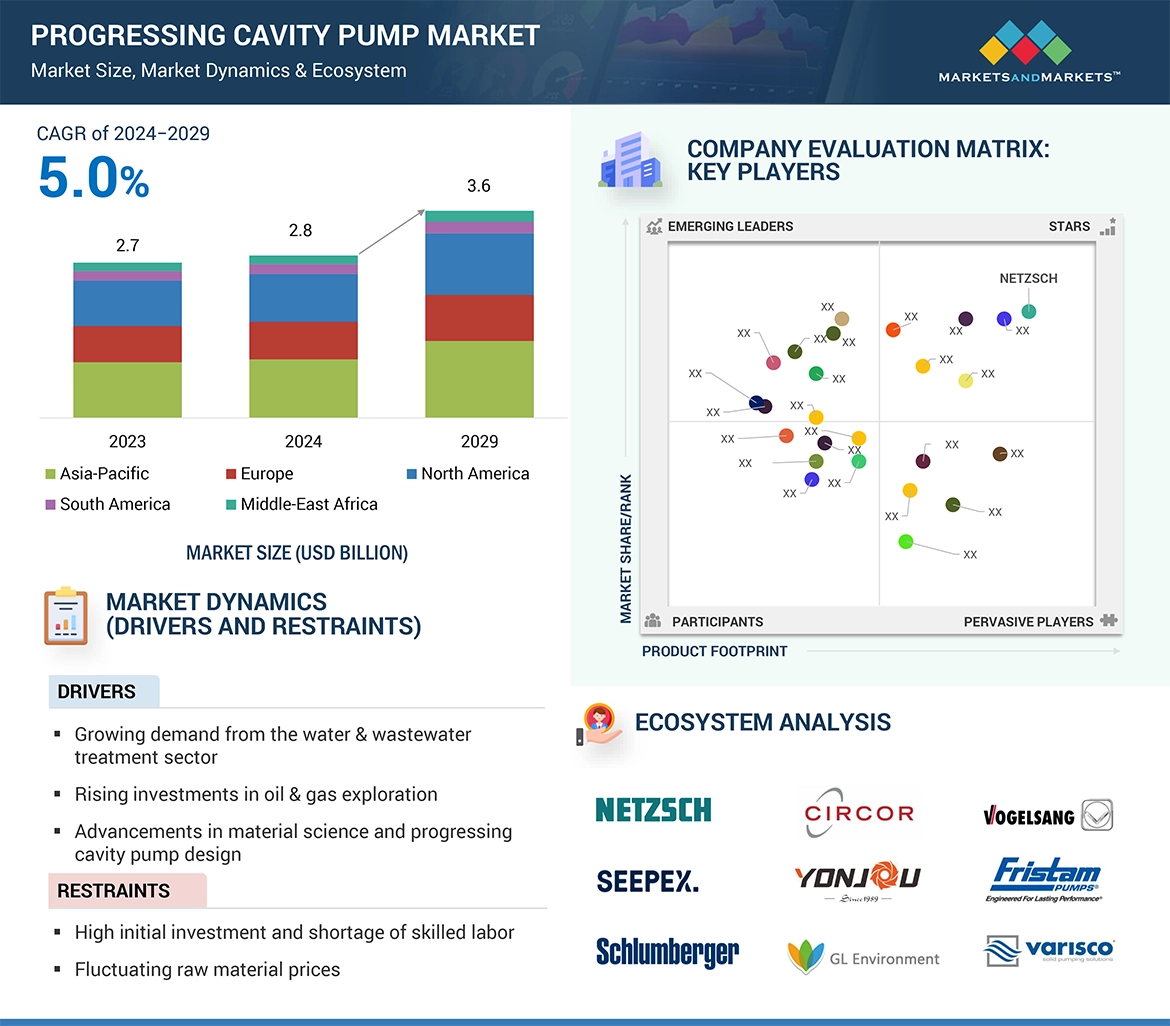 The progressing cavity pump market encompasses the production, distribution, and utilization of progressing cavity pumps, a type of positive displacement pump characterized by a helical rotor rotating inside a fixed stator. These pumps are widely employed across various industries for the efficient handling of viscous, abrasive, and shear-sensitive fluids, making them indispensable in applications ranging from oil and gas extraction to water and wastewater treatment, food and beverage processing, chemicals and petrochemicals, mining, and construction. Key components of the market include manufacturers of pump components and complete systems, assemblers, service providers offering maintenance and repair services, distributors facilitating the supply chain, and end-users spanning industrial sectors with diverse fluid handling requirements. Market dynamics encompass factors such as technological advancements, regulatory landscape, industrial expansion, infrastructure development, and environmental considerations, all of which influence the demand for progressing cavity pumps and shape market trends on a global scale.