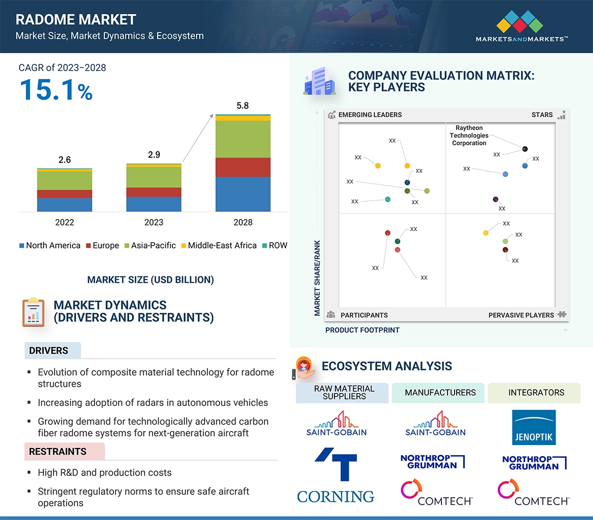 Note: An analysis of technological, military funding, year-on-year launches, and operational cost were carried out to arrive at the CAGR and understand the market dynamics of all countries in the report. The market share for all size, operational orbit, component, application, and end user was based on the recent and upcoming launches of radome in every country from 2023 to 2028.