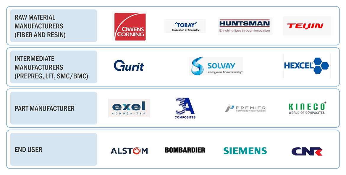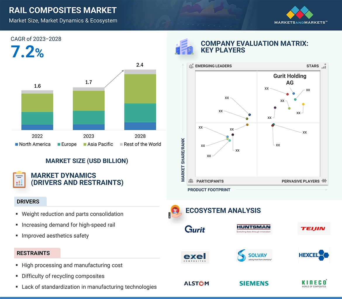 A composite is a combination of two or more materials that have better properties than those of the individual components. It is a blend of least two immiscible components, with different structures, whose individual features combine to provide improved performance. Composites are formed by a combination of a matrix and reinforcement. In a composite, fibers are reinforced and are used to fortify the matrix in terms of strength and stiffness. The reinforcement fibers can be cut and aligned in different ways to affect the properties of the resulting composites. The matrix, normally, a form of resin, keeps the reinforcement in the desired orientation and also protects the reinforcement from chemical and environmental attack. The composites that gets used in rail exterior, interior, structural and other rail applications are considered as rail composites.